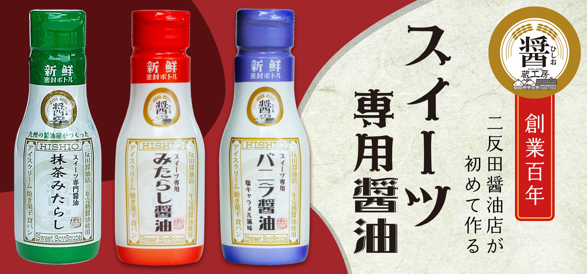 二反田醤油店の三年完熟醤油でつくったスイーツ専用醤油です。アイスクリーム、ヨーグルト、和洋焼き菓子、クラッカー、食パンにもご使用いただけます。