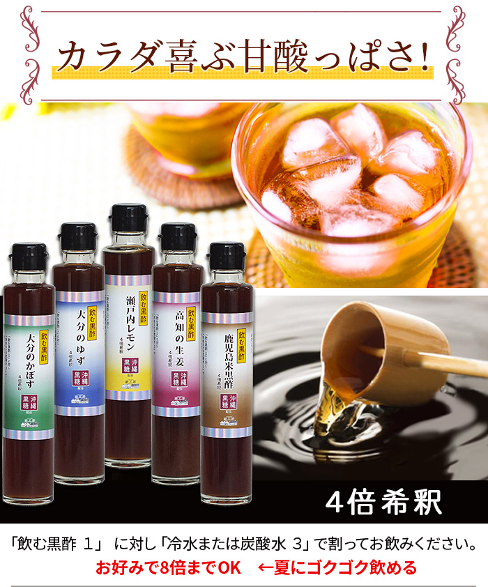 鹿児島「黒酢」と沖縄県波照間の「黒糖」を配合しました。「飲む黒酢 1」 に対し「冷水または炭酸水 5」で割ってお飲みください