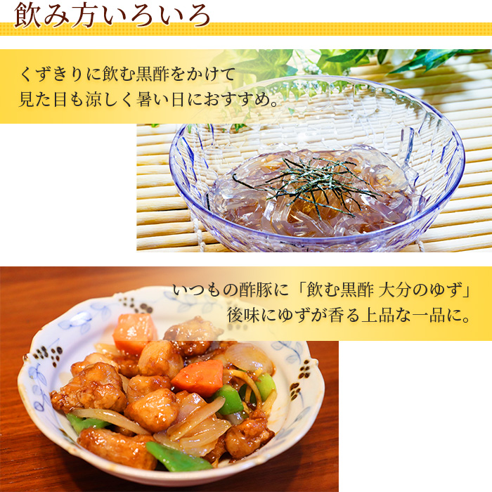 「黒酢」に大分県産「ゆず」と沖縄県波照間の「黒糖」を配合しました。「飲む黒酢 1」 に対し「冷水または炭酸水 3」で割ってお飲みください
