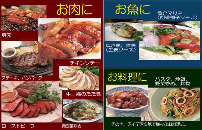 大分特産の柚子胡椒を使用した、「ピリ辛スパイシーソース」。 ステーキや焼肉のたれ、チキンソテーなどの肉料理に、 魚介類にあえるとピリ辛和風マリネに。 その他お好みでいろんなものにかけたり混ぜたり。